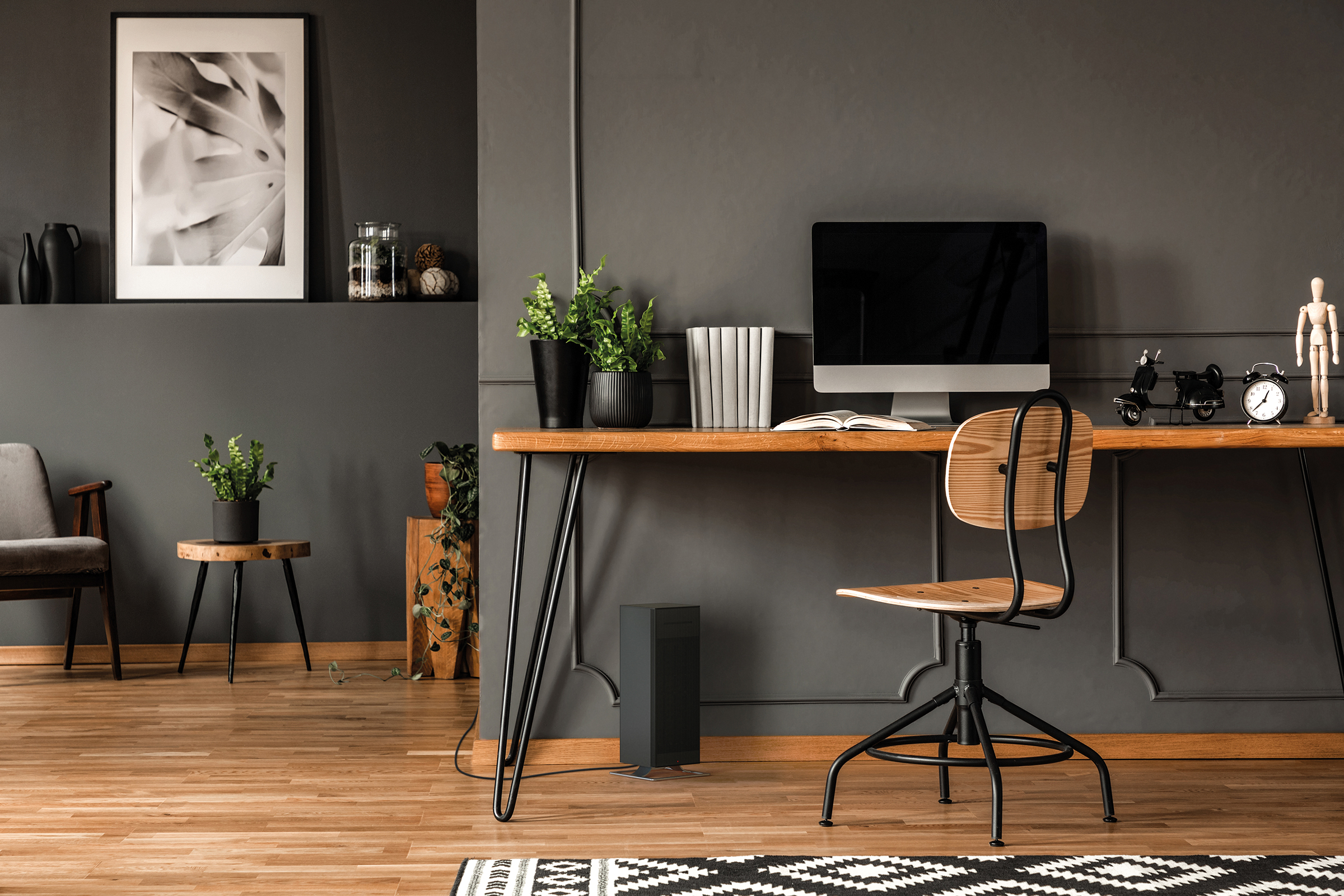 Bez zapnutého ústredného kúrenia sa práca v domácej kancelárii zmení na utrpenie. Sedíte za pracovným alebo jedálenským stolom s čajom v ruke a vlnenými ponožkami na nohách. Začína vám byť zima. Aby ste predišli strate koncentrácie a znecitliveniu prstov, umiestnite elektrický ohrievač Anna pod stôl. Pokiaľ tam ostanete sedieť, nastavte ju do automatického režimu. Vďaka technológii Adaptive Heat si ohrievač Anna reguluje svoj výkon, a to na základe aktuálnej a požadovanej teploty. Keď teplota klesne pod požadovanú úroveň, automaticky sa zapne. Keď stúpne, zareaguje vypnutím. V dôsledku toho je ohrievač Anna s technológiu Adaptive Heat až o 12 % energeticky účinnejší ako porovnateľné ohrievače bez tejto funkcie. Pre porovnanie – počítač, na ktorom práve beží program na spracovanie obrazu, spotrebuje pri najnižšom nastavení 300 wattov, čo je približne rovnaké množstvo elektriny ako ohrievač Anna. Prekvapivé, však?