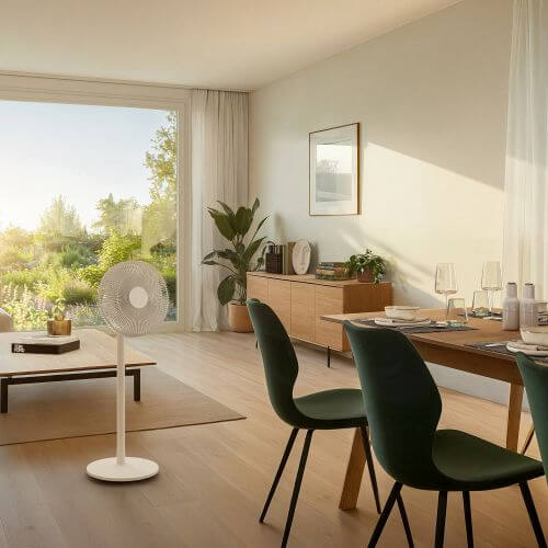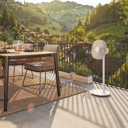 Ventilátor Finn Mobile je prvý ventilátor od Stadler Form určený do exteriéru aj interiéru. S certifikáciou IP44 je odolný voči striekajúcej vode a bez obáv ho môžete používať v krytých vonkajších priestoroch, ako je terasa, balkón alebo záhradné sedenie.